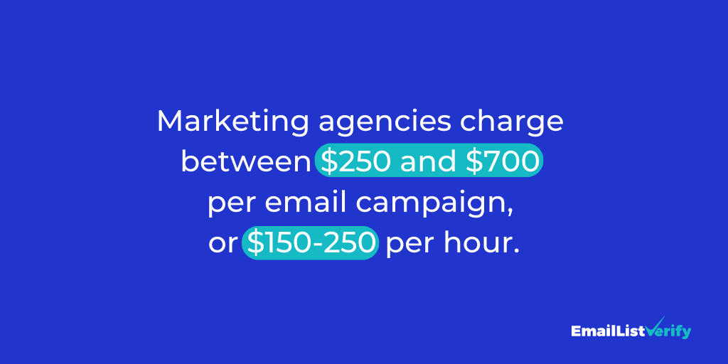 Flowium estimates that marketing agencies charge between $250 and $700 per email campaign or $150-250 per hour, depending on the agency. Major campaigns could be charged by the project and cost as much as $11,000.